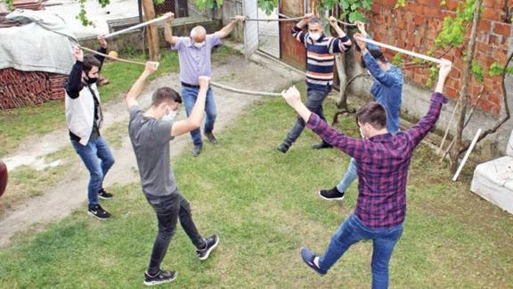 Ellerine aldıkları 1.5 metrelik çubuklarla horon oynayan Çavuş Ailesi doyasıya eğlendi. Salih Çavuş, “Biz Karadenizliyiz, koronavirüs olduğu için böyle bir şey düşündük. Mesafeli sopalarla hem kendimiz öğrenelim hem de eğlendirelim diye böyle bir şey yaptık” dedi.