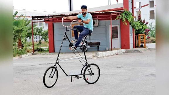 Adana'da bir bisiklet tasarımcısı koronavirüse karşı sosyal mesafeyi korumak için 2 buçuk metre yüksekliğinde ‘Koronasiklet' isminde bir bisiklet tasarladı.