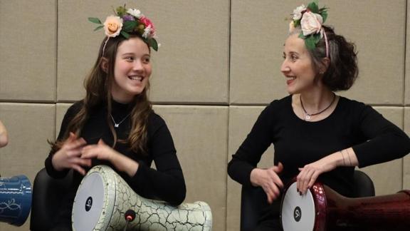 Aynı sahneyi paylaşan anne ve kızı, bir yandan darbukanın ritmini tutarken, diğer yandan da dinleyenlere keyifli anlar yaşatıyor.
