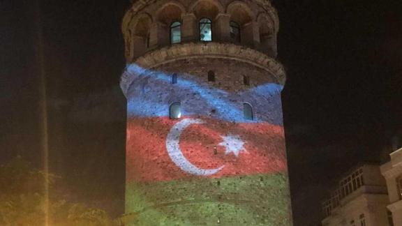 Azerbaycan'a destek maksadıyla İstanbul'un simgelerinden olan Galata Kulesi Azerbaycan bayrağının renkleriyle aydınlatıldı.