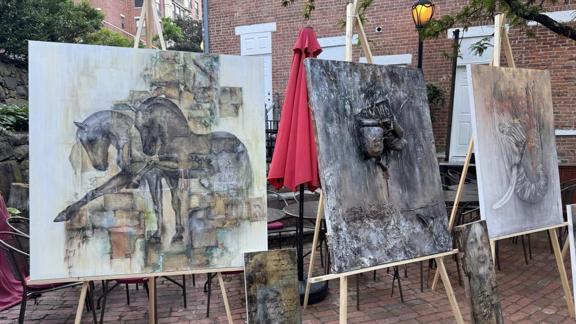 Resim çalıştığı tuvallerin üzerine, günlük hayatta kullanılan birçok maddeyi ekleyerek eserlerini 3 boyutlu hale getirmeyi tercih eden Koray Kasap'ın karma sergisindeki konu çeşitliliği de dikkati çekti. Kasap'ın sergisinde, "Nefsini Terbiye Eden Derviş", "Ayasofya" ve "Filistinli Anne" gibi çalışmaları en çok ilgi gören eserleri arasında yer aldı. Filistinli bir anneyi kefiyesi altına korumaya çalıştığı iki çocuğuyla resmeden Kasap, "Biz Filistin için bir şey yapamadık. İçimiz acıdı. Bizi yaralayan bir şey, dünyanın çoğu da görmezlikten geldi. Ben en azından seçkimde Filistin için de bir çizim olsun istedim." dedi. Kasap, dünyaca tanınmış mücevher tasarımcısı Sevan Bıçakçı'nın Türkiye'den arayıp Filistin konulu eseri için tebrik ettiğini ve bu tabloyu kendisine ayırması ricasında bulunduğunu söyledi. Kasap, kendisinin de bu tablonun gelirini Filistinli çocuklar için bağışlayacağını ifade etti. Eserlerinin çoğunu çizerken malzeme olarak hazır boya yerine odun kömürü ve kahve kullandığını belirten Türk sanatçı, bu şekilde tuvalde daha transparan ve organik bir yüzey oluşturabildiğine değindi. Kasap'ın karma seçkisinde, efsanevi boksör Muhammed Ali'den esinlenerek yaptığı "Boxer" adlı çalışmasının yanı sıra insanlık tarihinde ayrı bir yeri olduğuna inandığı birçok at figürünün yer aldığı eserler de bulunuyor.