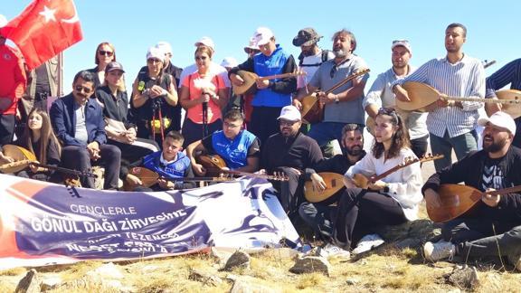 Yaklaşık bir saatlik yürüyüşün ardından zirveye ulaşanlar, Türk bayrağının hemen yanı başında 40 sazı aynı anda çalarak Ertaş'ın "Gönül Dağı" ile farklı türkülerini seslendirdi.