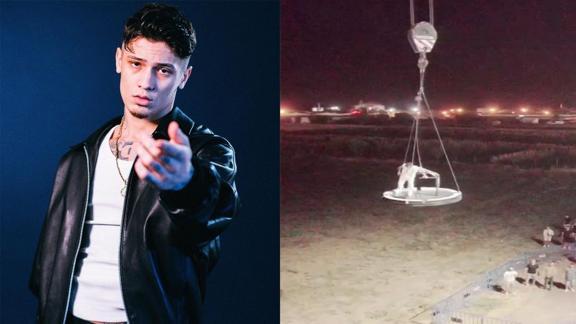 Rapçi, UFO görünümlü özel tasarlanmış vinçle gökyüzünden inerken balon oyunu için kullanılan silahla F.D. isimli şahıs havaya kontrolsüzce ateş edince bacağından vuruldu.
