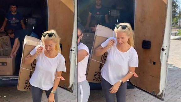 Orman yangınlarının gerçekleştiği Muğla Bodrum'a giden Esmersoy, burada araçlardaki yardım kolilerini sırtladı ve binaya koyup yardımlarının ulaştırılması için çalıştı.