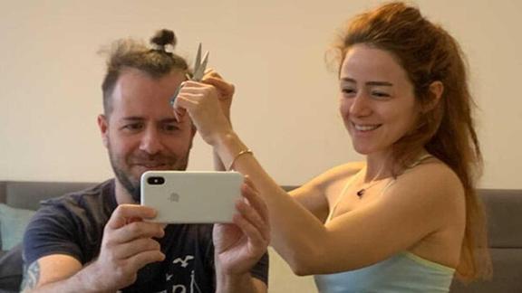 Korona yüzünden 1 aydır berbere gidemeyen Emre Aydın, çözümü saçlarını eşi Eda Köksal Aydın’a emanet etmekte buldu.