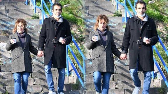 Yasağı delerek açık olan bir kafeden kahvelerini alan Derya Karadaş ve eşi Haki Biçici, ardından Cihangir Parkı'na doğru el ele yürüdü. Merdivenlerden inerken bir yandan deniz manzarasını keyifle izleyen ikili, fotoğraflarının çekilmesiyle kısa süreli şaşkınlık yaşadı.
