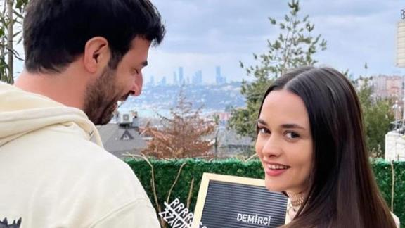 Ünlü çift verdikleri pozda, doğacak olan oğullarının ismine de yer verdiler. "Ali Demirci geliyor" diyen çiftin mutlulukları, fotoğraf karesine de yansıdı.