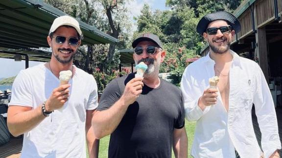 Hem yüzüp hem de denizde sohbet eden üçlü, daha sonra muhabbetlerine kaldıkları yerden teknede devam etti. Üçlünün keyifli anları kameralara yansıdı.