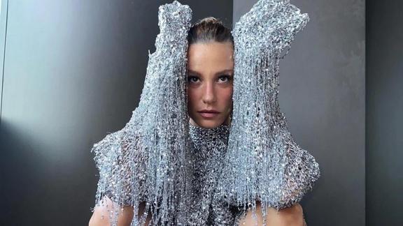 Gri tamamen pullardan oluşan bir elbise giyen Sarıkaya'nın kırmızı çiçek desenli ayakkabıları da olay oldu. Serenay Sarıkaya'nın farklı kombini adeta sosyal medyayı ikiye böldü.