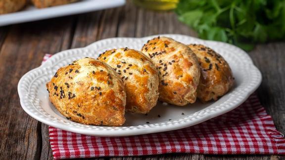 İç harcın alın, poğaçaların orta kısmına bir miktar beyaz peynir ekleyin ve iki tarafından kapatın.