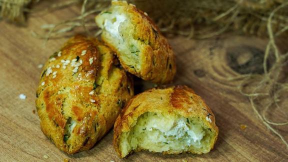 İç harcın alın, poğaçaların orta kısmına bir miktar beyaz peynir ekleyin ve iki tarafından kapatın.