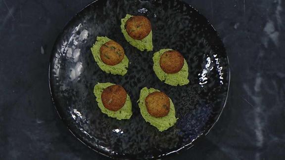 Bezelyeleri 1-2 dakika haşlıyoruz. Bezelyeleri blenderda taze nane, sarımsak ve krema ekleyerek çekiyoruz. Püreyi tavada ısıtıp yoğunlaştırıyoruz. Püreye kaşık yardımıyla şekil verdikten sonra üzerine tavuk köftelerini ekleyerek servis ediyoruz.