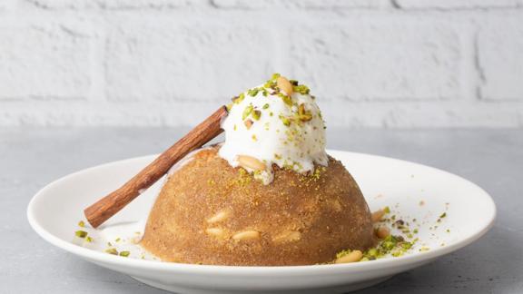 Üzerine tarçın, hindistan cevizi, Antep fıstığı ya da ceviz serpip soğuk servis et.