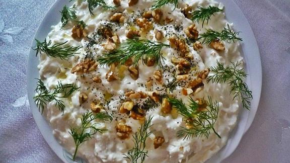 4-5 yemek kaşığı yoğurdun içerisine haşladığınız mercimekleri, 4-5 yemek kaşığı rendelenmiş çiğ kerevizi ve parçalara böldüğünüz 2 adet cevizi ekleyip iyice karıştırın.