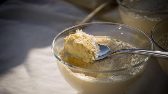 Hindistan cevizi ve kırılmış bademi bir kasede karıştırın ve servis etmeden önce muhallebilerin üzerine dökün.