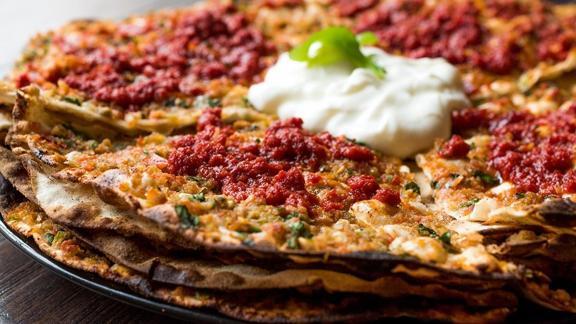 Hamurun birisini servis tabağınıza alın. Üzerine kıymalı harçtan sürün. diğer hamuru üzerine yerleştirin bu şekilde bir kat hamur bir kat kıyma olacak şekilde kat kat yerleştirin.