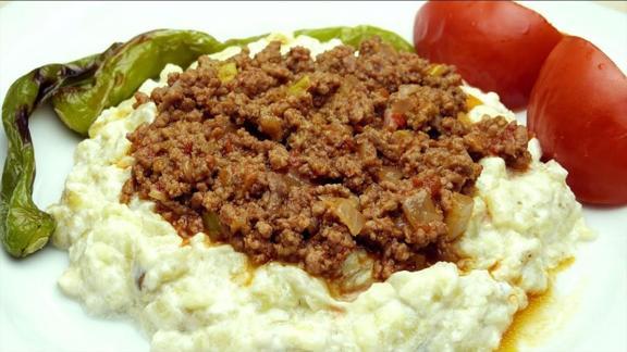 Ayrı bir tavaya 2 çorba kaşığı tereyağını koyun. Küçük doğranmış soğanları pembeleşene dek kavurun. Kıymayı ilave edin. 2-3 dakika sonra küçük doğranmış domatesleri, sivri biberleri, 3 kahve fincanı et suyunu ve tuzu ekleyin. 10 dakika sonra ateşten indirin. beğendinin üzerine kıymalı harcı koyup, servis yapın.