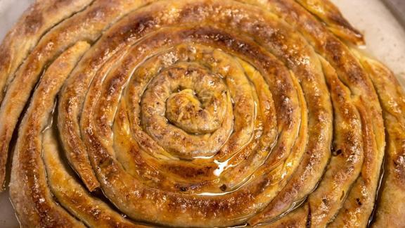 6. Rulo halindeki yufkalar iki uçtan büzülerek kıvırılır ve yağlanmış tepsiye dizilir.