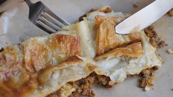 Yufkaların hazırlanması: Yufkaları tezgahın üzerine serin. Bir yufkayı alın, üzerine süt ve sıvı yağ karışımını gezdirin. Ardından, kıymalı harcı yufkanın her yerine eşit bir şekilde yayın. Yufkayı rulo şeklinde sarın.