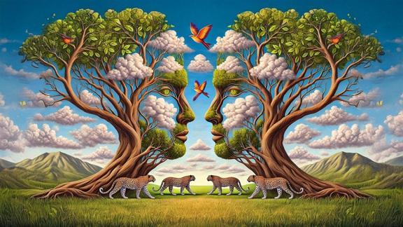 Bir resme bakıp "ne gördüğünü" anlatmak aslında iç dünyayı dışa vurmanın en sade yollarından biri. Kişilik testinde yer alan optik illüzyonda doğa unsurlarından oluşmuş simetrik yüz illüzyonları içeren iki sürreal manzara görseli bulunuyor. Ağaçlar, bulutlar ve leoparlar bir araya gelerek etkileyici bir görsel yanılsama sunuyor. Siz optik illüzyona baktığınızda resimde ilk ne gördünüz?