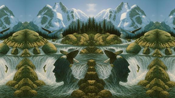 Optik illüzyonda dağlardaki yüz silueti, suyun içinde insan silueti, kartal, balık ve doğa manzarası yer alıyor. Her detay güvenle ilgili başka bir karakter analizini temsil ediyor. Sezgiler, empati, sadakat, güç ve bilinçaltı burada ortaya çıkıyor.