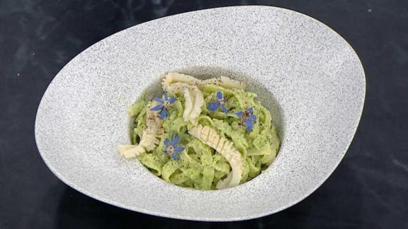 Parmesan peyniri, fesleğen, sarımsak, avokado, yeşil elma ve kremayı blenderda çekiyoruz. Sosu tavada kaynatarak makarnayla karıştırıyoruz. Makarnamızı, kalamarla birleştirerek tabaklıyoruz.