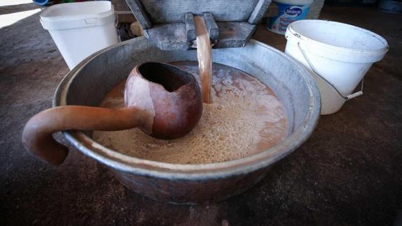 İlçedeki bağlardan hasat edilen beyaz üzümün, dağdan getirilen killi toprakla karıştırılmasıyla suyu çıkarılıyor.