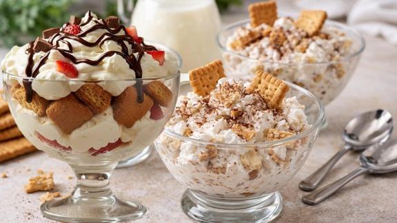 Krem şantiyi soğuk süt ile çırpın. Bisküvileri iri parçalar halinde kırın.