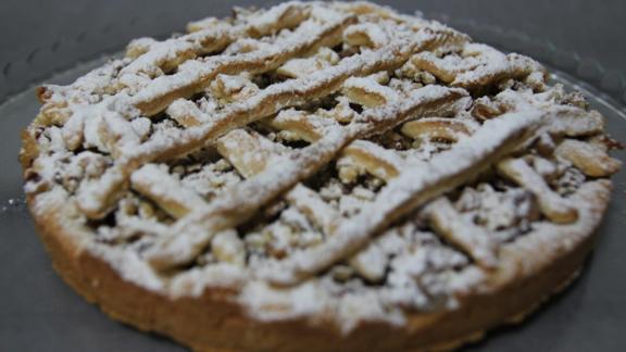 Hamurun bir kısmını üst şeritleri için ayırın. Hamuru kabımıza yayın. Elma harcını hamurun üzerine yayın.