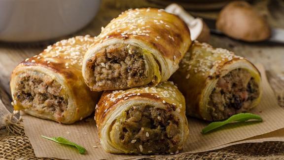 Yufkaların hazırlanması: Yufkaları tezgahın üzerine serin. Bir yufkayı alın, üzerine süt ve sıvı yağ karışımını gezdirin. Ardından, kıymalı harcı yufkanın her yerine eşit bir şekilde yayın. Yufkayı rulo şeklinde sarın.