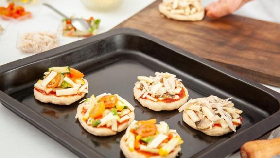 Ceviz büyüklüğünde parçalar al, yuvarlayıp bastırarak küçük diskler yapın. Üzerine sos, peynir ve sevdiğin malzemeleri koyun.