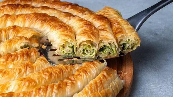 İlk yufkayı tezgaha serin ve üzerine eritilmiş tereyağı veya sıvı yağ sürün.