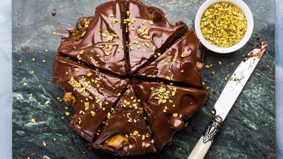 Çikolata sosunu hazırlayın ve soğuyan bol çikolata sosu ile kekin üzerini kapatın.