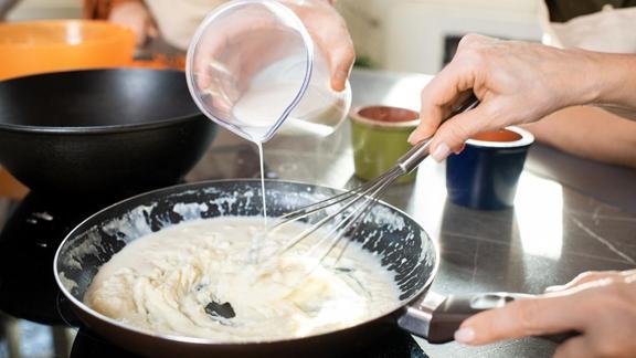 Süt hörresi çorbası tarifi için önce süt pişirilip soğutun. Soğutulan sütü tencereye koyun.