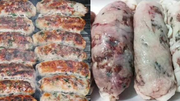 Kuzu gömleğini, köfteleri sarabilecek şekilde makas veya bıçakla kesin ve üzerine köfteyi koyup dolma sarar gibi sarın.