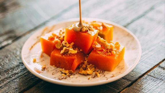 Pekmezli kabak tatlısını tahin ve ceviz ile servis edebilirsiniz.