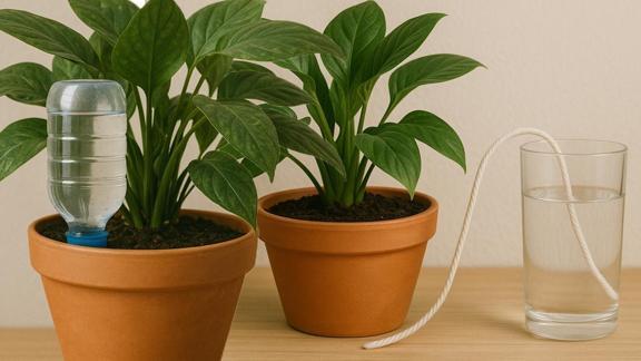 Kalın bir pamuklu ip alın. Bir ucunu su dolu bir kabın içine, diğer ucunu saksı toprağının alt kısmına yerleştirin. Su, ipten saksıya geçer.