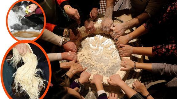 Yoğrulan macun, odanın ortasına kurulan siniye alınarak kavrulmuş unla, tel tel olana kadar çekiliyor. (Tereyağında kavrulmuş un)