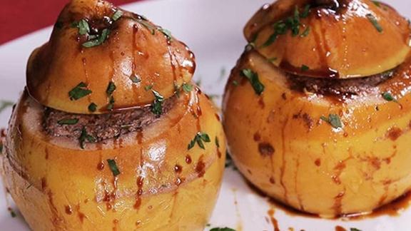 Ayvaların çekirdek yataklarına, hazırlanan etli karışımdan ikişer kaşık doldurun ve bir tencereye yerleştirin.