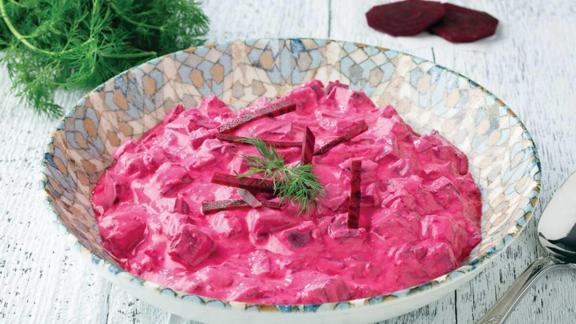 Geniş bir karıştırma kabında süzme yoğurdu, tuzu ve mayonezi çırpın. Kırmızı pancarların 4 adetini küp küp doğrayın. Kalan bir adet pancarı da ince şekilde rendeleyin. Pancarın rengini vermesi için rendeledikten sonra çıkan suyuda yoğurda ekleyin. Karışımı rengi verene kadar karıştırın ve soğuk şekilde salatayı sunun.