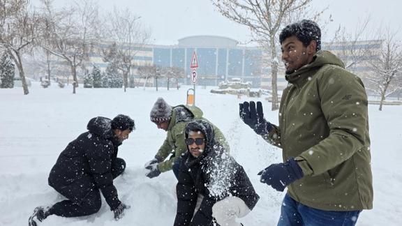 Afrika ile Güney Asya ülkesi Bangladeş'ten üniversite eğitimi için Bingöl'e gelen öğrenciler, çetin kış koşullarının etkili olduğu kentte kar görmenin mutluluğunu yaşadı. Öğrenciler, yağan karın keyfini kampüste arkadaşlarıyla kar topu oynayarak çıkardı.