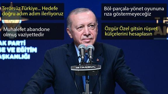 AK Parti'nin millete hizmet yolunda kurulmuş bir okul olduğunu, bu okulun müfredatını doğrudan milletin belirlediğini anlatan Erdoğan, "AK Parti ailesinin her üyesi bu okulun öğrencisidir. Teşkilatımız ne kadar güçlü olursa, ülkemize o kadar iyi hizmet ederiz. Hareketimize gönül veren her bir kardeşimizin bilgisiyle, vizyonuyla, dava ahlakıyla hareket etmesi, kendisini en iyi şekilde yetiştirmesi bizim temel önceliğimizdir. Bu anlayışla oluşturduğumuz AK Parti Sürekli Eğitim Merkezi yalnızca bugünün değil, Türkiye Yüzyılı'nın kadrolarını da yetiştiriyor. Teşkilat Akademisi, Akademi Genç, Akademi Kadın, Yerel Yönetimler Akademisi, Danışman Akademisi, Yurt Dışı Akademisi, Medya Akademisi ve Siyaset Akademisi, aydınlık yarınlarımızı inşa edecek liderleri hazırlıyor." diye konuştu.