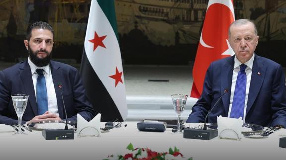 Başkan Recep Tayyip Erdoğan, Suriye Cumhurbaşkanı Ahmed Şara ile bir araya geldi. Başkan Erdoğan ile Suriye Cumhurbaşkanı Şara arasında 1,5 saat süren görüşmesi sona erdi. Görüşmeye ilişkin Cumhurbaşkanlığı İletişim Başkanlığı açıklamada bulundu. Suriye Cumhurbaşkanı Şara'nın yaptırımların kaldırılmasındaki kritik destek ve emekleri için başkan Erdoğan'a teşekkürlerini sunduğu bildirildi. Görüşmede Başkan Erdoğan, Suriye'nin toprak bütünlüğünün korunarak ülkenin ve ordunun tek bir merkezden idare edilmesinin önemli olduğunu söyledi.