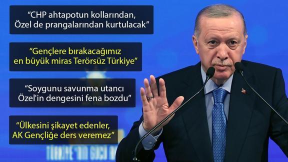 Başkan Erdoğan , AK Gençlik'in ufkunun, siyasi becerisinin, bilgisinin ve vatan sevdasının, "CHP'li kodamanlardan fersah fersah ileride" olduğunu vurgulayarak, "Batılı televizyon kanallarına ülkesini şikayet edenler, kusura bakmasınlar ama AK Gençlik'e ne ahlak dersi ne de vatan dersi verebilir." ifadelerini kullandı.