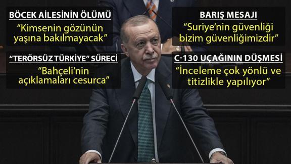 Azerbaycan-Gürcistan sınırında düşen kargo uçağında şehit olan 20 asker ve yangın söndürme uçağı pilotunun geçen hafta dualar ve gözyaşları ile hakka uğurlandığını anımsatan Erdoğan, şehitlere Allah'tan rahmet, ailelerine, yakınlarına sabır ve başsağlığı diledi.