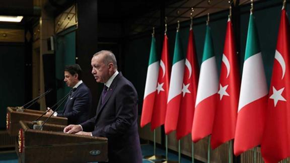 Sayın Putin'le ateşkes hakkında açıklama yaptık. Ateşkes yürürlüğe girmiş oldu. Heyetlerimiz ilgili tüm tarafların katılımıyla bugün Moskova'da görüşmelerine devam ediyor. Yakın zamanda bir ateşkes anlaşmasının imzalanmasını özellikle temenni ediyorum. İtalya'nın bu kulvarda gösterdiği çabaları takdirle karşılıyoruz. Türkiye'nin sahada sükunetin tesisi, terör tehdidinin bertaraf edilmesi hakkındaki çalışmalarımızla ilgili sayın Conte'yi bilgilendirdim. İdlib'deki ateşkesin önemine dikkat çektim. İtalya'nın da desteğini beklediğimizi vurguladım. Görüşmelerimizde Türkiye-AB ilişkilerini de ele aldık. AB'den beklentilerimizi ayrıntılı bir şekilde izah ettim.