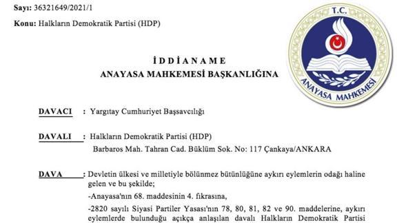 Yargıtay Cumhuriyet Başsavcılığı'nın HDP hakkında açtığı kapatma davasına ilişkin hazırlanan 609 sayfalık iddianamenin detayları ortaya çıktı. "HDP ile PKK-KCK arasında bir fark yoktur. HDP silahlı terör örgütü PKK-KCK'nın emir ve talimatları doğrultusunda faaliyet yürüten yaptıkları veya yapmadıkları bakımından örgüte hesap veren, terör örgütünün siyasi görünümlü bir uzantısı, organıdır. Başka bir deyimle HDP; PKK'nın partisidir" denildi. İşte o tespitler: