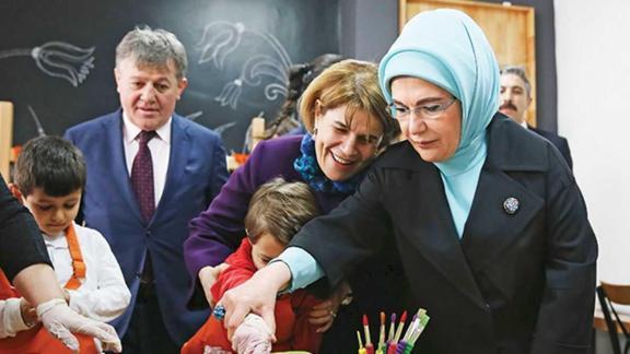 Emine Erdoğan, atölyeleri ziyaret ederek çocuklarla birlikte faaliyetlere katıldı.