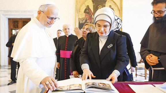 Başkan Erdoğan'ın eşi Emine Erdoğan, Papalık Sosyal Bilimler Enstitüsü'ndeki 'Kardeşlik Temelli Ekonomi: Etik Çoktaraflılık' başlıklı etkinlikte konuşmak için Vatikan'a gitti; Apostolik Sarayı'nda Papa 14. Leo ile görüştü. Görüşmede, İsrail saldırısı ve ablukası altındaki Gazze'de yaşanan insanlık dramının üzerinde durulurken, Emine Erdoğan, kalıcı ateşkes ve insani yardımların ulaştırılması için Papa'ya "Gazze konusunda Hıristiyan dünyası daha gür sesle destek çıkmalı" çağrısı yaptı. Papa'nın da Erdoğan'a, Vatikan'ın Filistin'de iki devletli çözümü ve barışı desteklediğini söylediği öğrenildi.