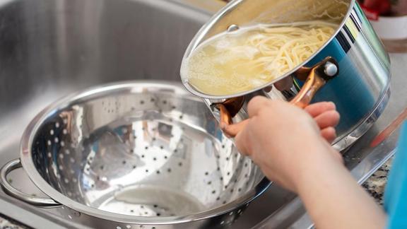 Makarna pişirdiğinizde, suyun kaynadığına ve makarnaların piştiğine emin olduktan sonra, makarna suyunu bir kaba dökün.
